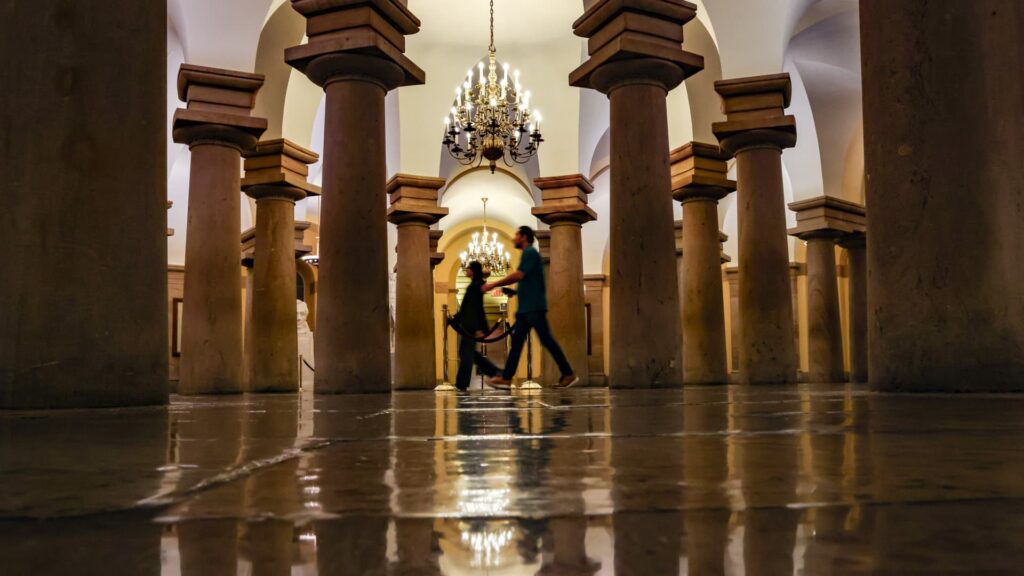 Workers walk through the crypt of the US Capitol in Washington, DC, US, on Wednesday, Oct. 8, 2025.