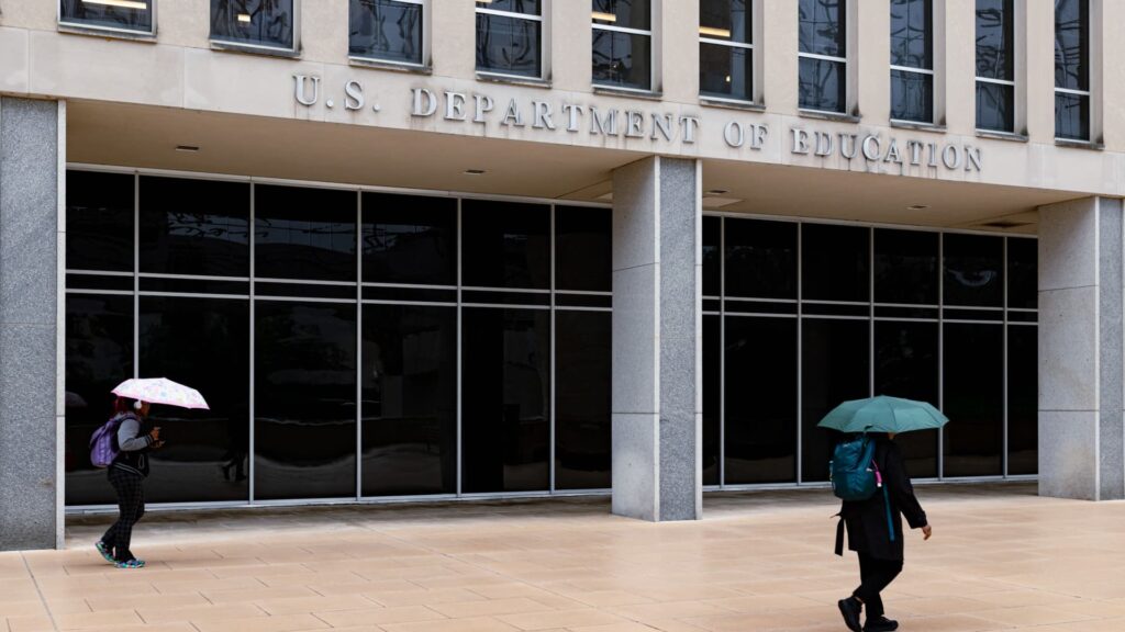 Workers leave the Department of Education building during a rain shower in Washington, D.C., on Wednesday, May 21, 2025.
