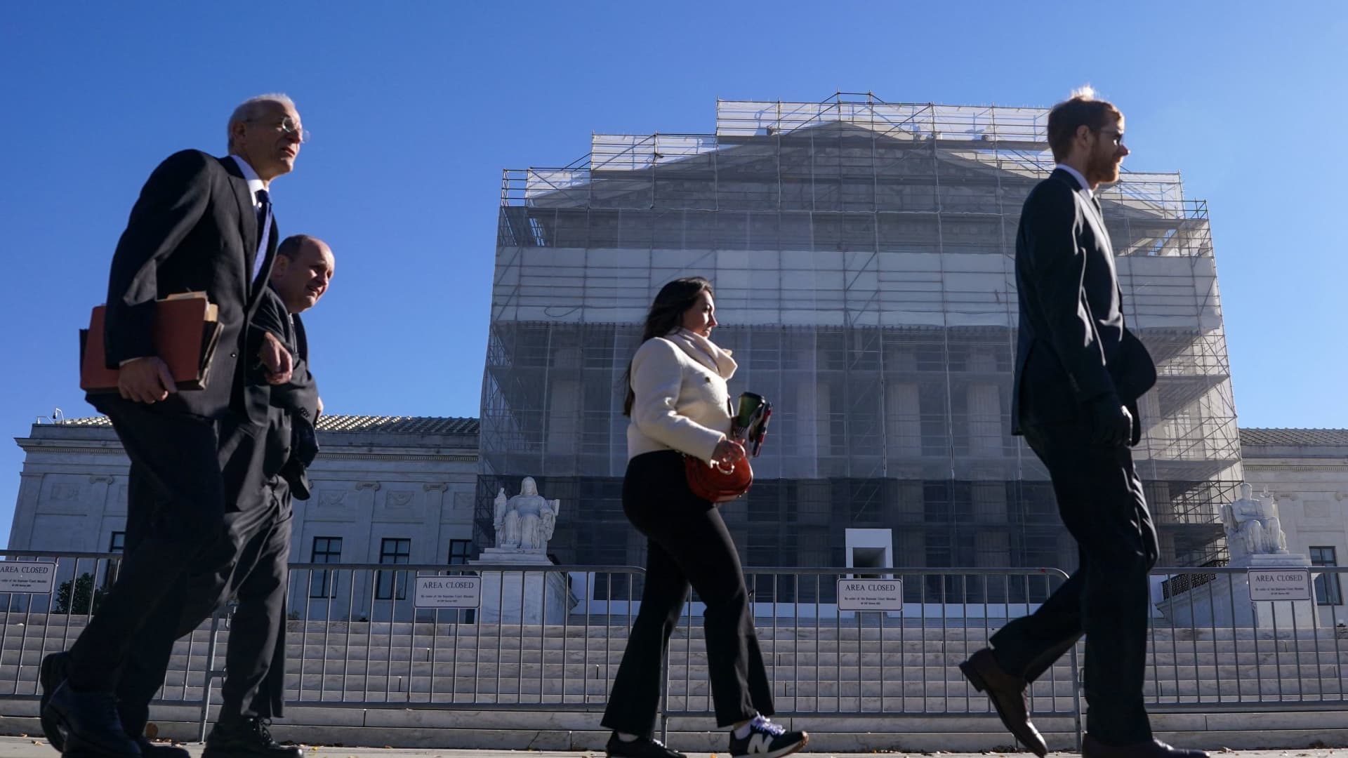 Members of the public walk outside the U.S. Supreme Court to attend oral arguments on U.S. President Donald Trump’s bid to preserve sweeping tariffs after lower courts ruled that Trump overstepped his authority, in Washington, D.C., U.S., Nov. 5, 2025.